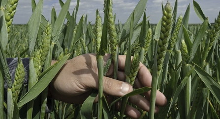 Farm manager Chris Bailey inspecting wheat crop at RSPB's Hope Farm. May 2011. - Chris Gomersall/2020VISION